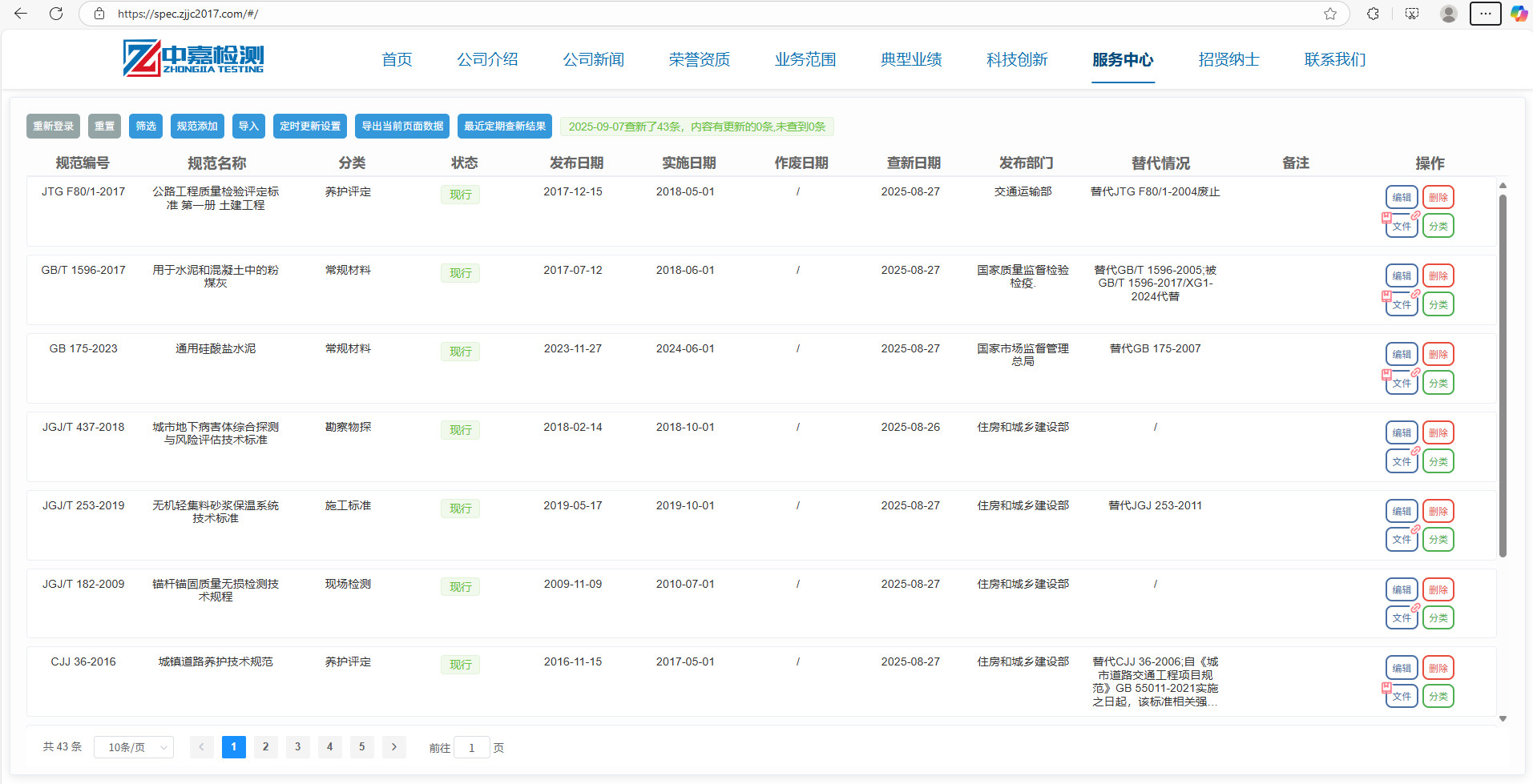 2025年9月5日,中嘉(广东)工程检测有限公司(以下简称“中嘉检测”)官方网站正式上线“检测规范自动查新服务”!该服务面向全行业免费开放,致力于通过信息化手段提升规范管理效率,推动检测工作向标准化、精细化和智能化迈进。