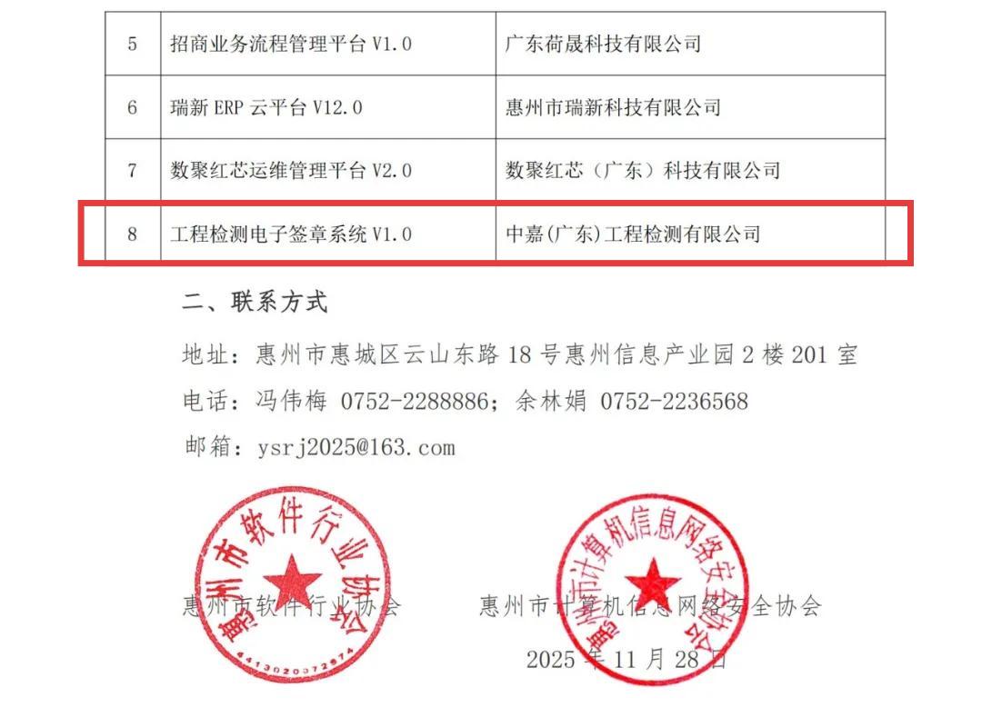 喜报|中嘉“工程检测电子签章系统”入选惠州市优秀软件产品目录