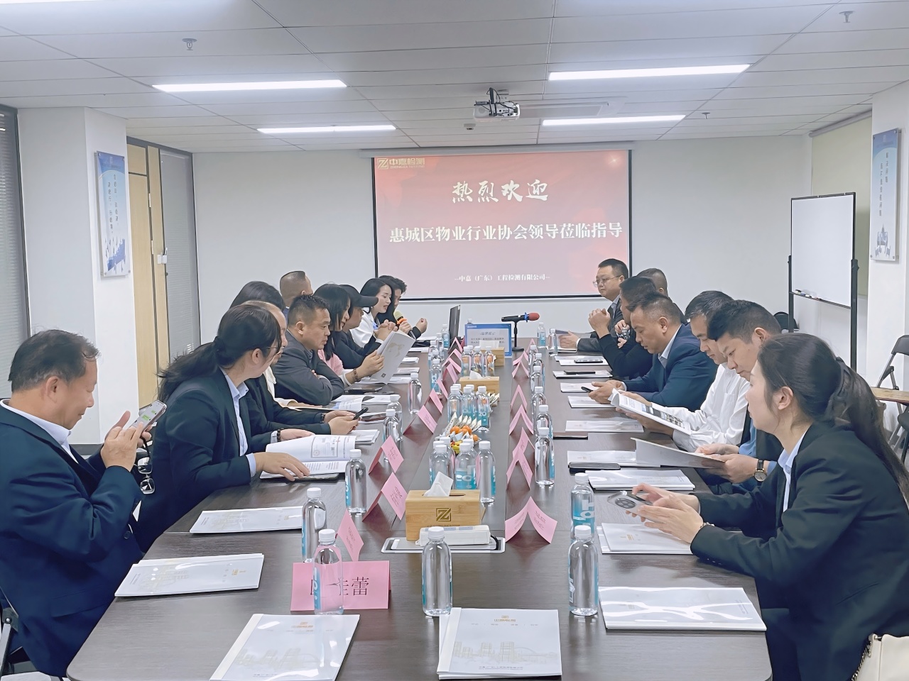 今日,惠城区物业行业协会朱刚刚会长率协会领导及同仁一行莅临中嘉(广东)工程检测有限公司参观指导。中嘉检测黄香莲总对协会的各位领导、专家的到来表示热烈欢迎,并围绕"专业检测助力物业安全管理"这一主题开展了深入交流。