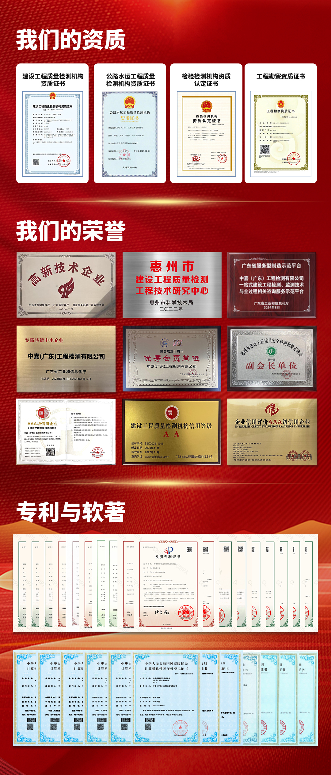 中嘉(广东)工程检测有限公司成立于2017年10月,总部位于广东惠州,业务网络遍布全省13个地市。作为惠州首个拥有“建设工程九大专项检测资质”的第三方综合性检测机构,公司资质能力全面,覆盖建筑工程、公路水运、岩土勘察、绿色建筑、市政工程等多领域,承检的惠州北站项目荣获中国建设工程鲁班奖。近三年来,公司自主立项研发项目16项,累计获得专利与软件著作权30余项,并与深圳大学、中山大学等高校建立了深度产学研合作,为省级工程技术研究中的建设奠定了坚实基础。